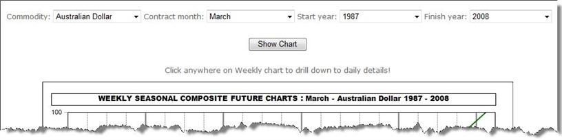 First, let's look at a sample Seasonal Chart. Here is a chart of the March Australian Dollar futures contract. The chart shows an aggregated trend covering the years of 1987 to 2008.